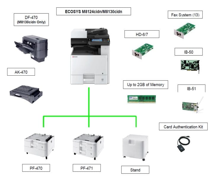 - PF-470 Paper Feeder: Adds 500 sheets with a cabinet drawer.