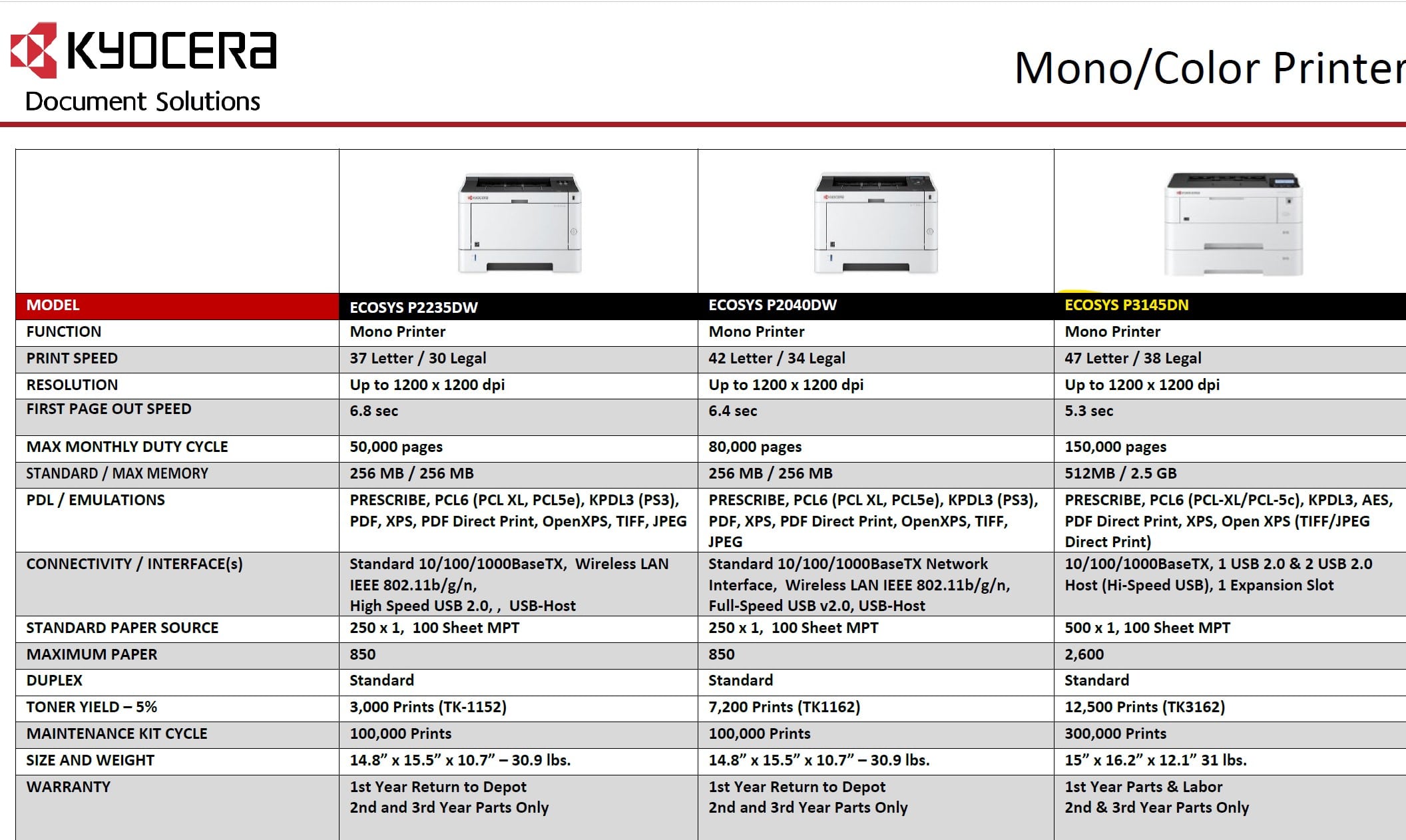 The KYOCERA ECOSYS P3145dn delivers desktop power and productivity at lightning speeds! Businesses that demand exceptional performance, reliability and versatility in a black & white printer need look no further than this compact, yet powerful, workhorse. With print speeds up to 47 ppm and standard duplex, the ECOSYS P3145dn can keep up with the demands of even the most fast-paced workgroup. Keep your workforce productive with On-The-Go mobile printing and walk-up USB capability. With exceptionally high paper capacity and a host of optional features, including advanced security and expandable storage, the ECOSYS P3145dn will help shift your document imaging into overdrive.