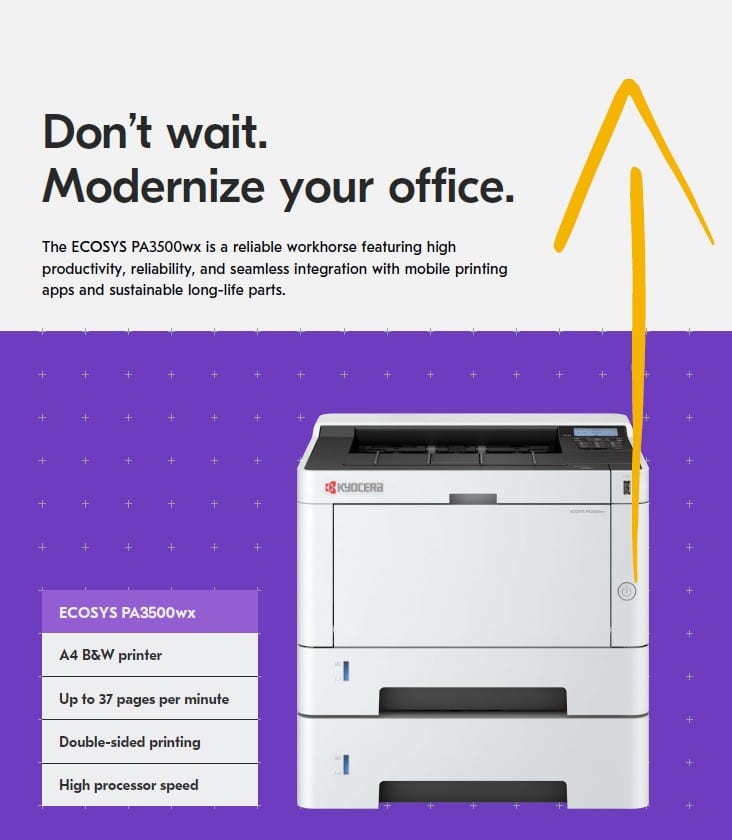 The Kyocera ECOSYS PA3500wx is a compact and efficient A4 black-and-white printer designed for fast-paced office environments. Built with long-life components and advanced mobile printing support, it delivers dependable performance with low operating costs. With a first page out in just 6.4 seconds and print speeds up to 37 pages per minute, the PA3500wx is ready to meet the needs of small to medium workgroups requiring robust, secure, and environmentally conscious printing solutions.